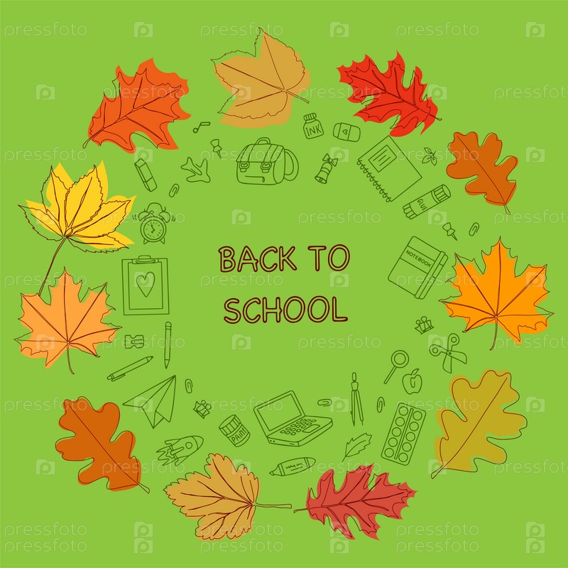 Баннер 'Назад в школу'. набор канцелярских принадлежностей и осенние листья с рисунками одной линии. школьные принадлежности в стиле doodle. векторная иллюстрация. вектор