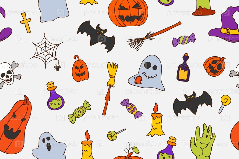 Милый бесшовный рисунок на Хэллоуин с паутиной, призраками и тыквами. милый дизайн doodle. комплект фонариков Джека. забавный нарисованный doodle, текстильный графический дизайн. обои, оберточная бумага, фон