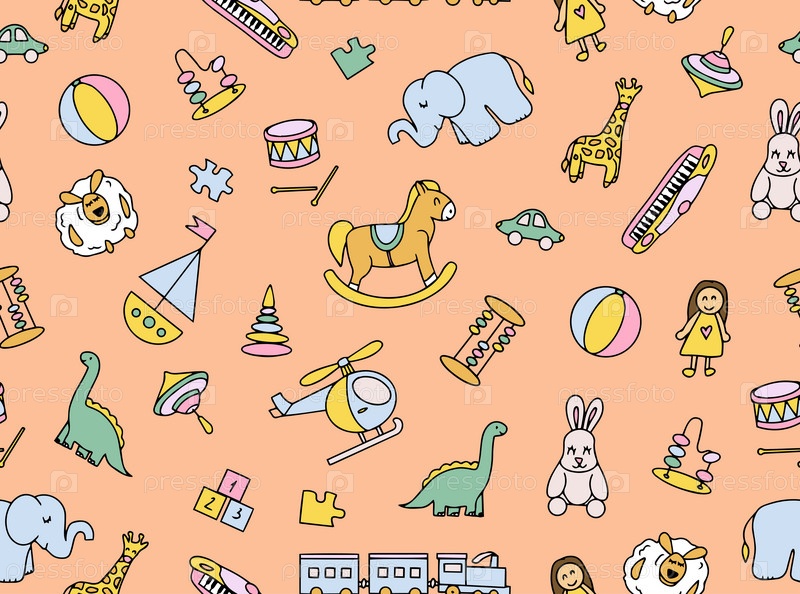 Бесшовный узор детских игрушек. Красочные забавные каракули с детскими рисунками. Векторная иллюстрация