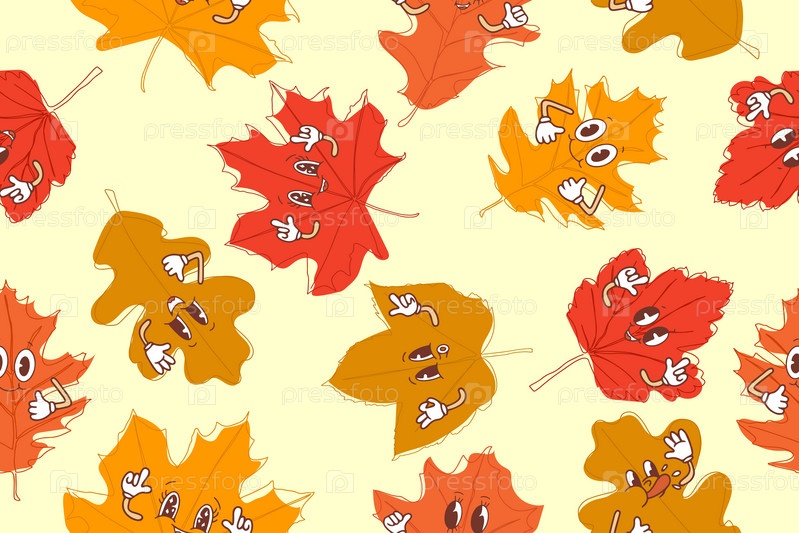 Бесшовный узор из осенних листьев в стиле каваий. Векторная иллюстрация на желтом фоне