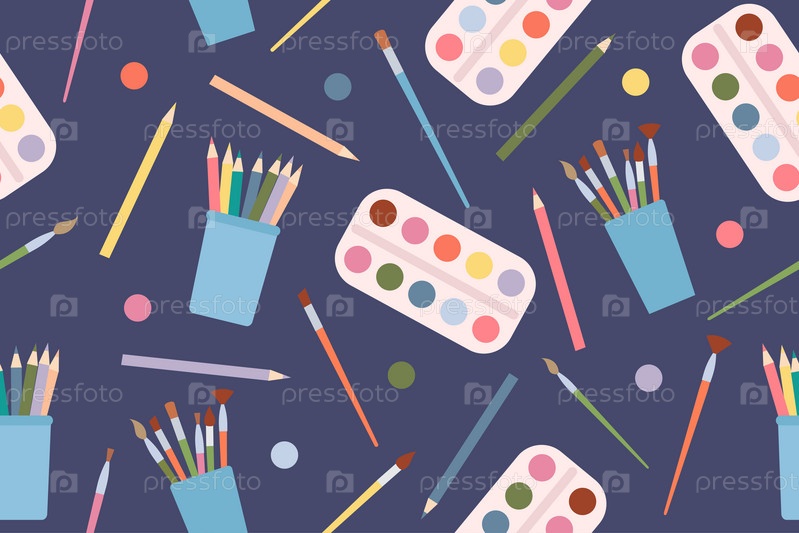 Бесшовный узор с художественными принадлежностями на синем фоне. Вектор. Векторная иллюстрация