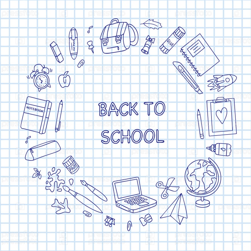 Баннер «Назад в школу». Набор рисунков канцелярских принадлежностей, нарисованных от руки. Школьные принадлежности в стиле каракули. Векторная иллюстрация. Вектор