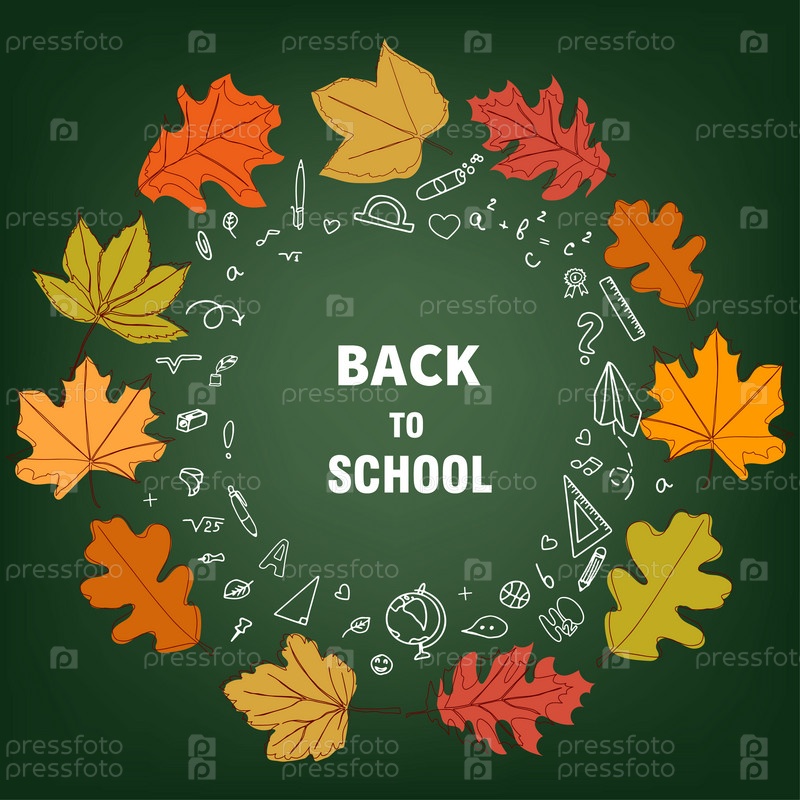 Баннер "Назад в школу". Набор канцелярских принадлежностей и осенних листьев. Школьные принадлежности в стиле каракули. Вектор