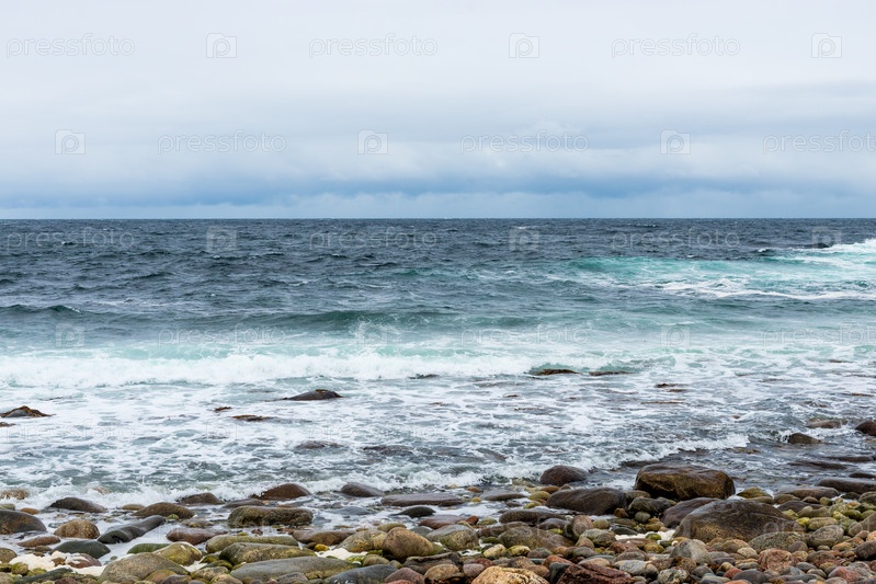 Опасная морская волна обрушивается на скалистое побережье с брызгами и пеной перед штормом в Баренцевом море