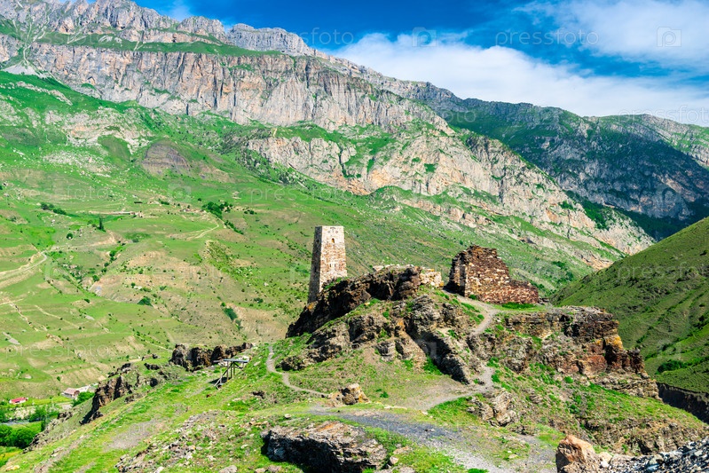 Руины башни Курта и Тага в горах Северного Кавказа. Россия
