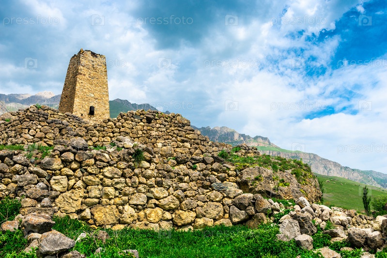 Каменные руины башни старого города в горах Северного Кавказа. Россия