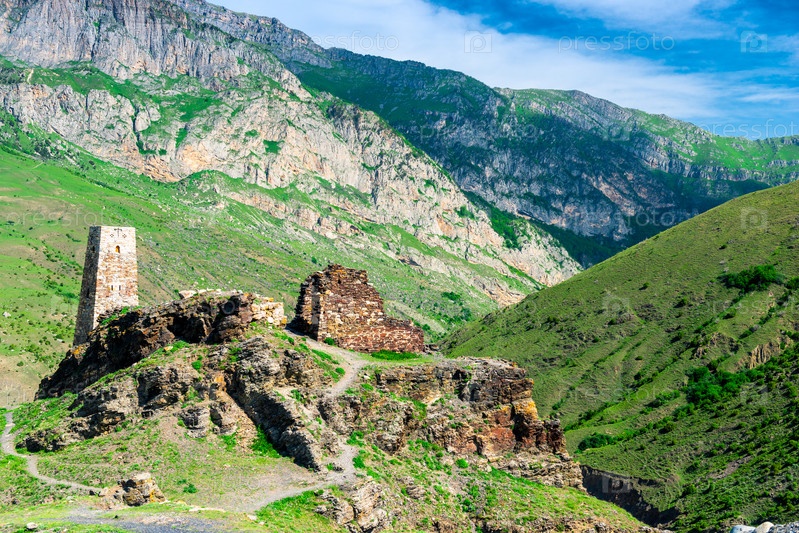 Руины башни Курта и Тага в горах Северного Кавказа. Россия