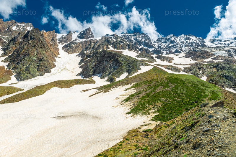 Снег в котловине высоких скалистых гор ледника Фейри в горах Северного Кавказа. Россия