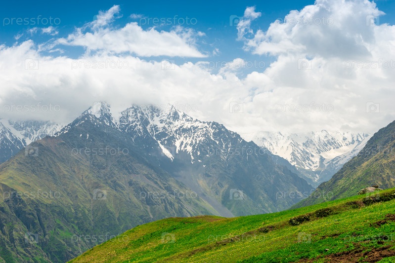 Прекрасный вид на зеленые альпийские луга на фоне белых вершин Северо-Кавказского хребта