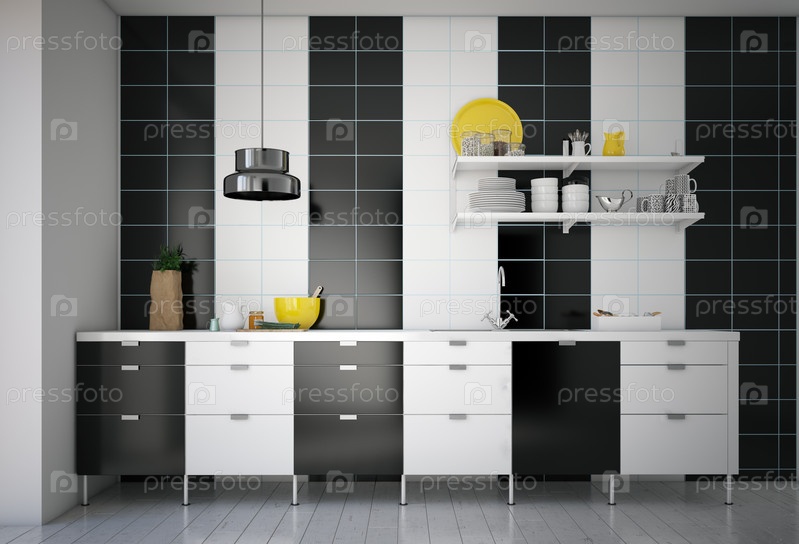 Кухня с черно-белыми шкафами,