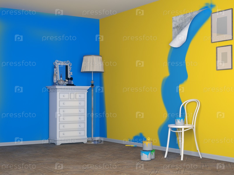 На снимке запечатлена комната с недавно окрашенными яркими стенами,