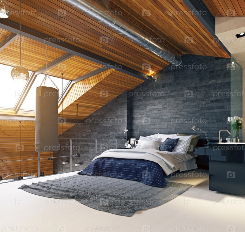 Современный интерьер спален в стиле лофт. 3d визуализация дизайна