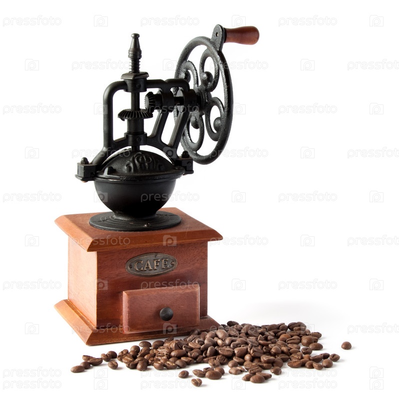 Ретро кофемолка на белом фоне с кофейными зернами