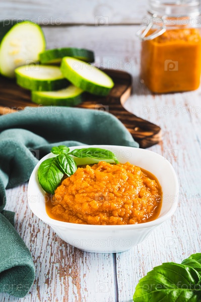 Вкусная икра из кабачков и базилика в миске на столе вертикальный вид