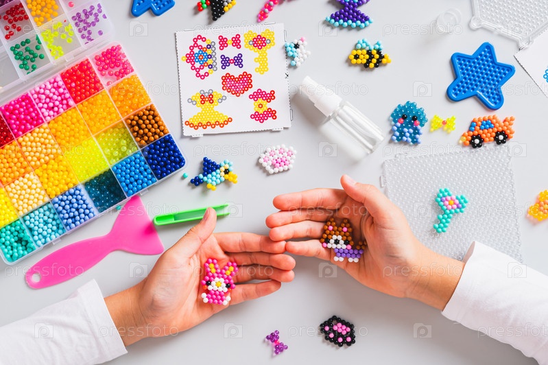 Руки детей держат игрушки из разноцветных аквабусинов и набор для творчества на столешнице