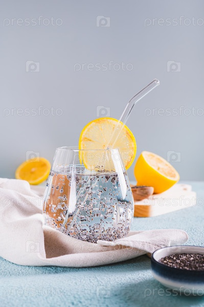 Детокс-вода чиа с долькой лимона в стакане на столе вертикальный вид