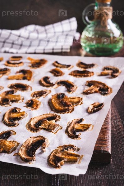 Запеченные острые грибные чипсы на бумаге на деревянной доске вертикальный вид