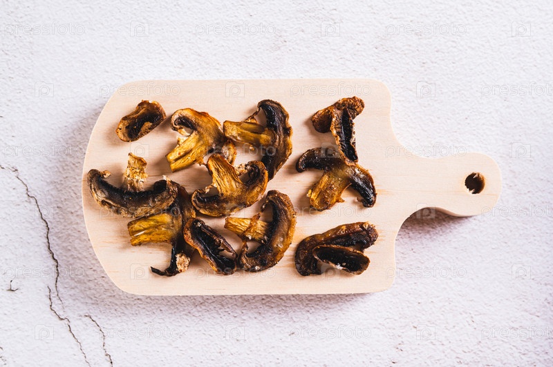 Хрустящие запеченные чипсы шиитаке со специями на деревянной доске на столешнице