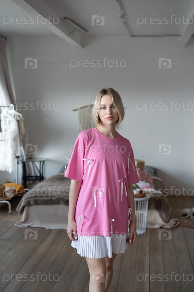 Молодая красивая женщина позирует в розовой футболке в студии