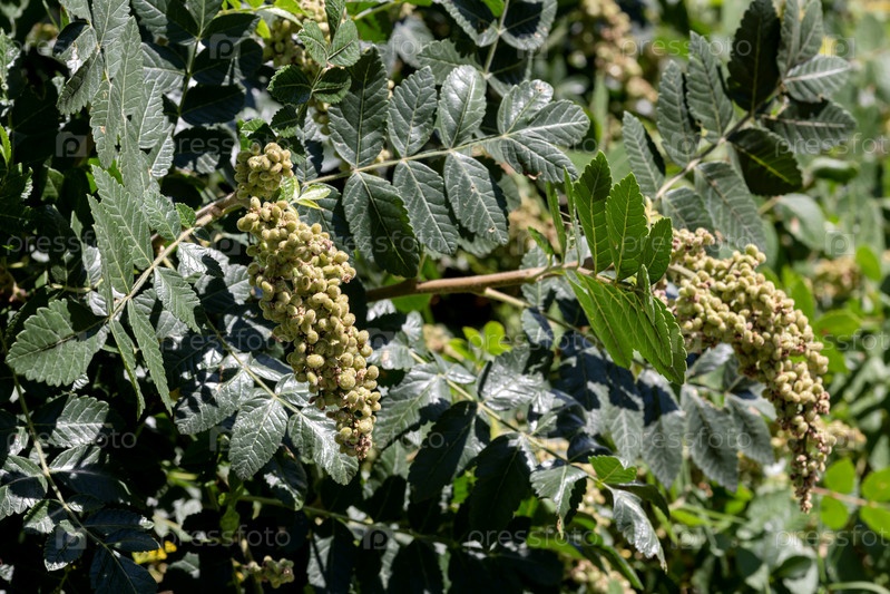 В лесу растет полезное растение (Rhus coriaria) с созревающими гроздьями