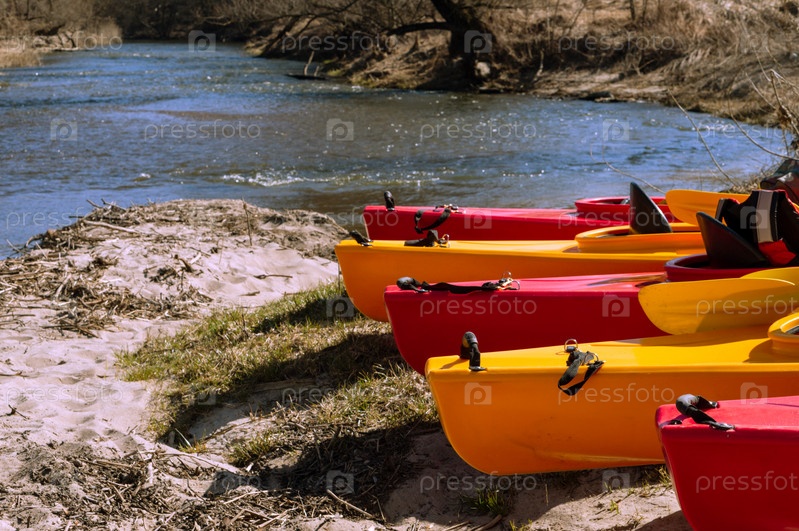 Байдарка на берегу реки. Активное времяпрепровождение выходного дня. Спортивный туризм. Сплав на байдарках весной. Байдарки из желтого и красного пластика