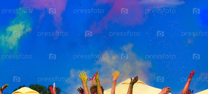 На красочном празднике Холи, руки подняты вверх, позади голубое небо