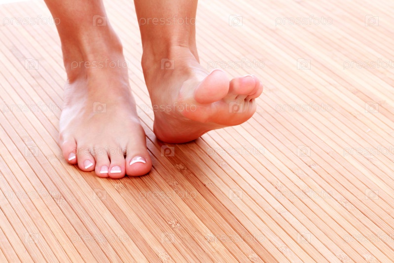 Женские ноги на бамбуковом коврике