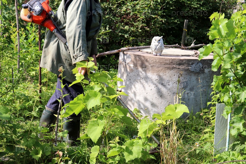 Садовник косит траву в саду у колодца бензокосилкой