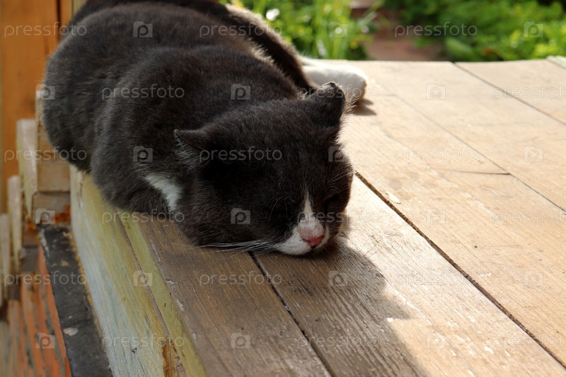 Серый кот спит на деревянном крыльце сельского дома летом в тени