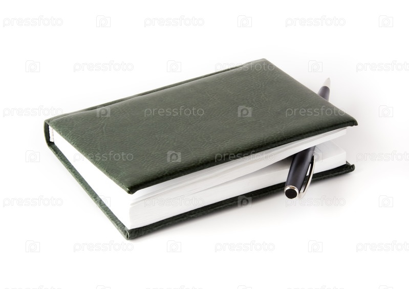 Блокнот в зеленой обложке и шариковая ручка на белом фоне