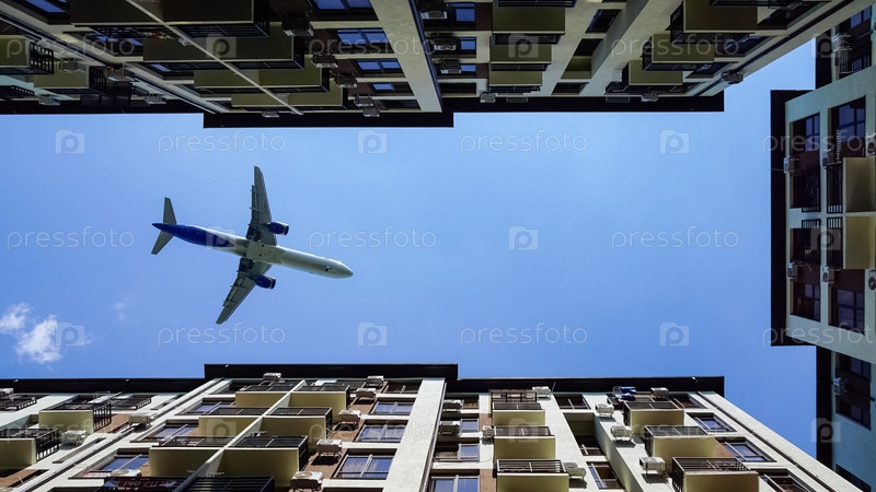 Самолет летит низко над домами