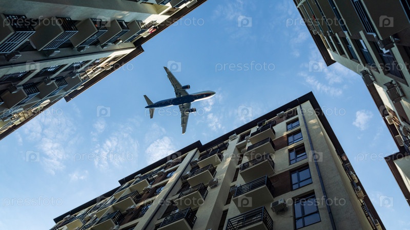 Самолет летит низко над домами