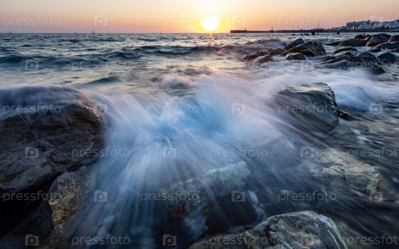 Красный закат в прибое на скалах и брызгах волн