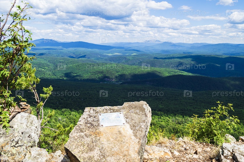 Камень с информационной табличкой на горе "Уфа". Природный пейзаж