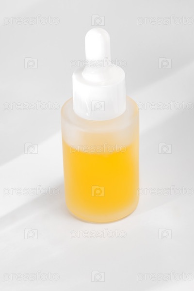 Вид сверху на флакон-капельницу из матового стекла с косметическим маслом для лица на мраморном фоне с драматическим светом. Антивозрастная сыворотка с ретинолом и активными ингредиентами