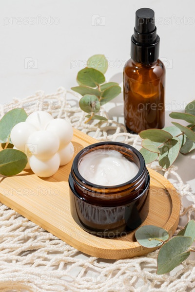 Набор косметических флаконов из янтарного стекла на деревянном подносе. Упаковка с помпой для флакона и баночки для крема. Дизайн упаковки косметических средств по уходу за кожей для ежедневной рутины. Ароматическая свеча для релаксации в спа