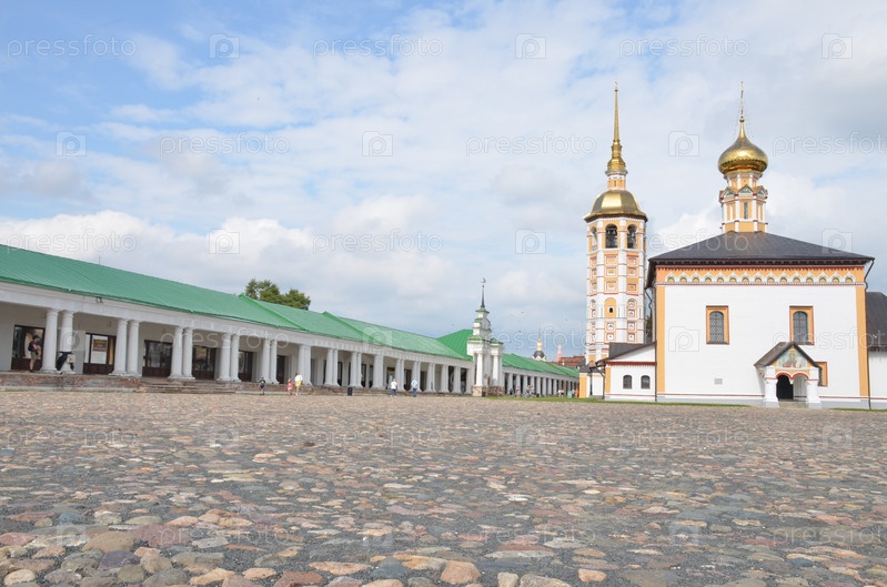 Вид на Торговую площадь города Суздаль Владимирской области, входящего в Золотое кольцо России: Торговые ряды и летняя Воскресенская церковь (Церковь вознесения на Торгу, Церковь Воскресения Словущего Воскресенского прихода)