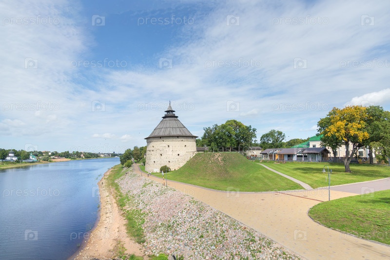 Прекрасный вид на реку Великую и Покровскую башню. Псков, Россия