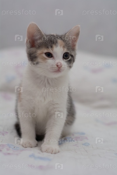 Котенок трехцветный, возраст один месяц, игриво позирует перед камерой