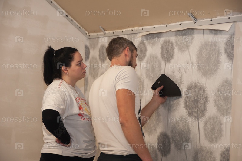 Молодая семья, парень и девушка, вместе делают ремонт, клеят обои и красят стены