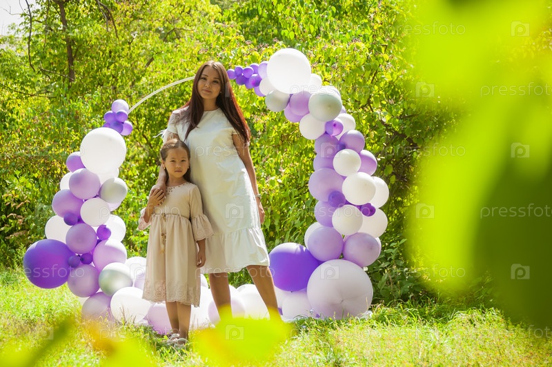 Мама и дочь 6 лет позируют на заднем плане, на природе среди зелени