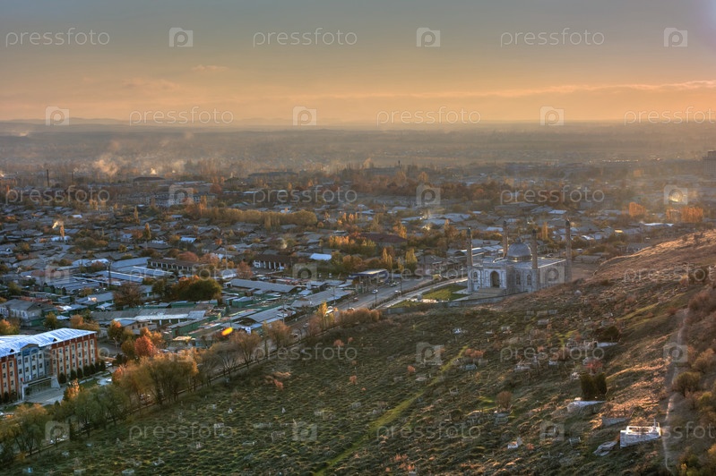 Мечеть на священной горе в городе Ошт на закате