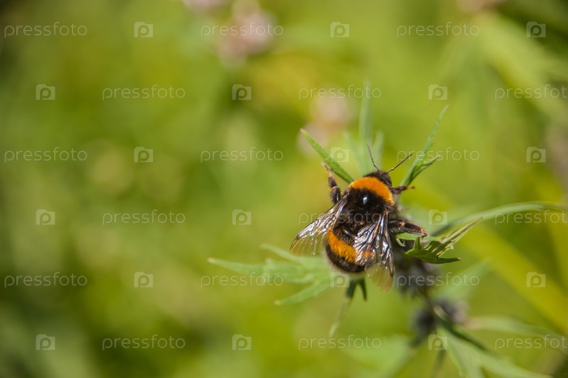 Черно-желтый полосатый горный шмель собирает пыльцу