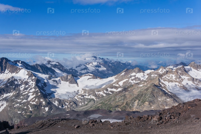Панорамный высокогорный ландшафт Кавказа, вершины и ледники среди облаков