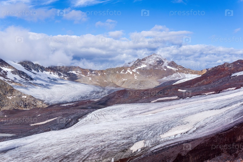 Высокогорный ландшафт Кавказа, вершины и ледники среди облаков
