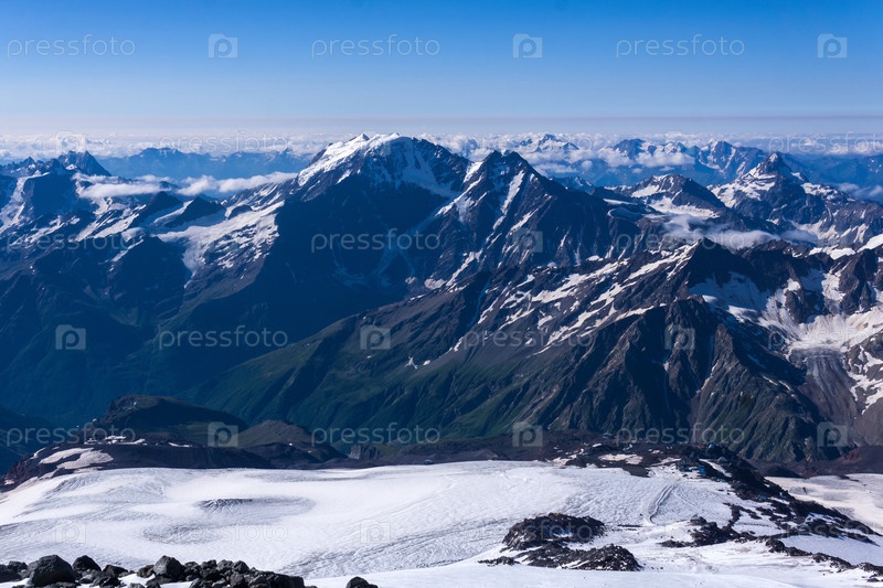Вид сверху на высокие горы над облаками со склона Эльбруса