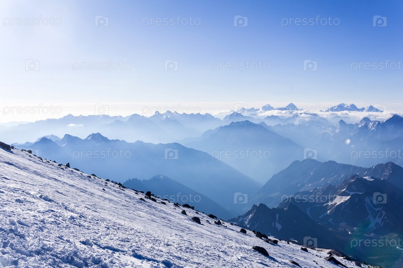 Вид с высокогорного снежного склона на туманные горы в лучах рассвета