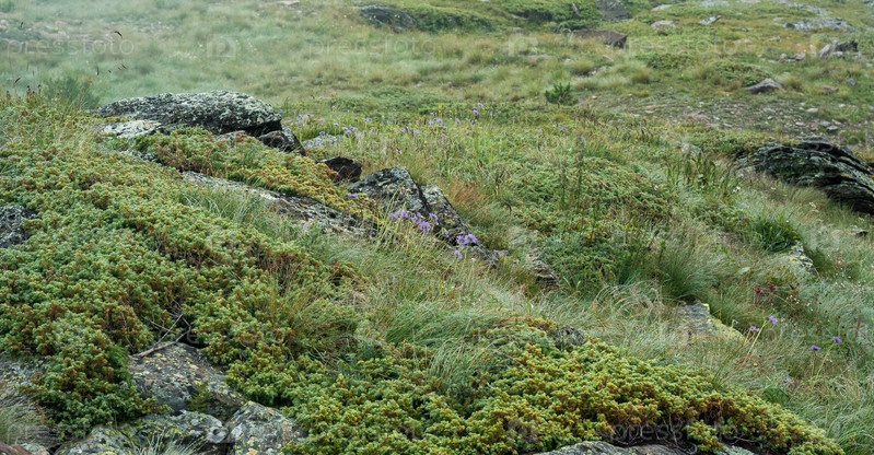 Альпийская луговая растительность среди камней крупным планом