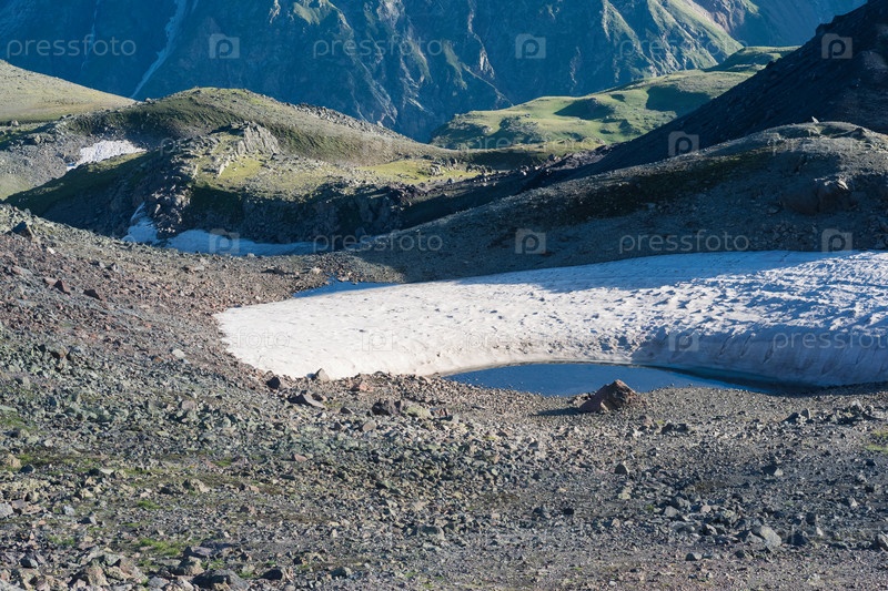 Горный ландшафт, скалистое ложе тающего ледника с талыми озерами