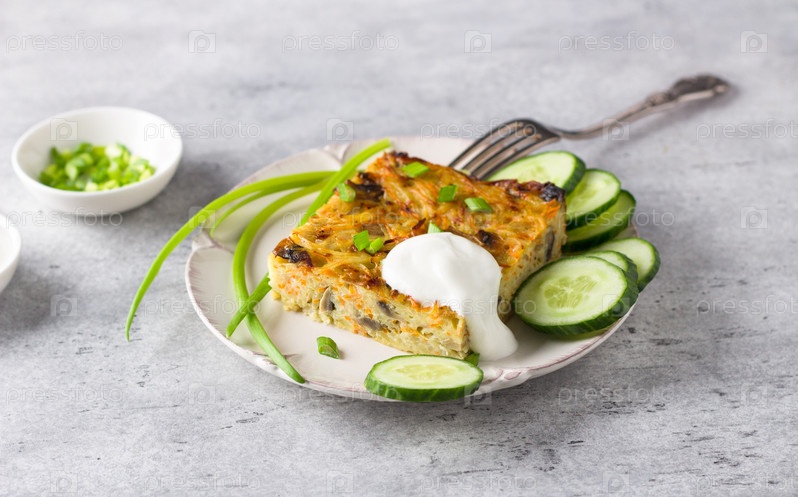 Овощная запеканка, кугель, из картофеля, моркови и грибов со сметаной, ломтиками огурца и зеленым луком на сером фактурном фоне